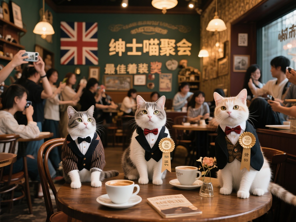 以某城市的一家猫咪主题咖啡馆为例,他们曾举办过一场名为“绅士喵聚会”的活动。店内布置成复古英伦风,猫咪们被主人装扮成小绅士模样,甚至还有“最佳着装奖”评选。活动当天,不仅吸引了众多顾客拍照打卡,还通过社交媒体传播,迅速成为当地热门话题。这不仅提升了咖啡馆的知名度,也让更多人感受到喵绅士文化的趣味性。